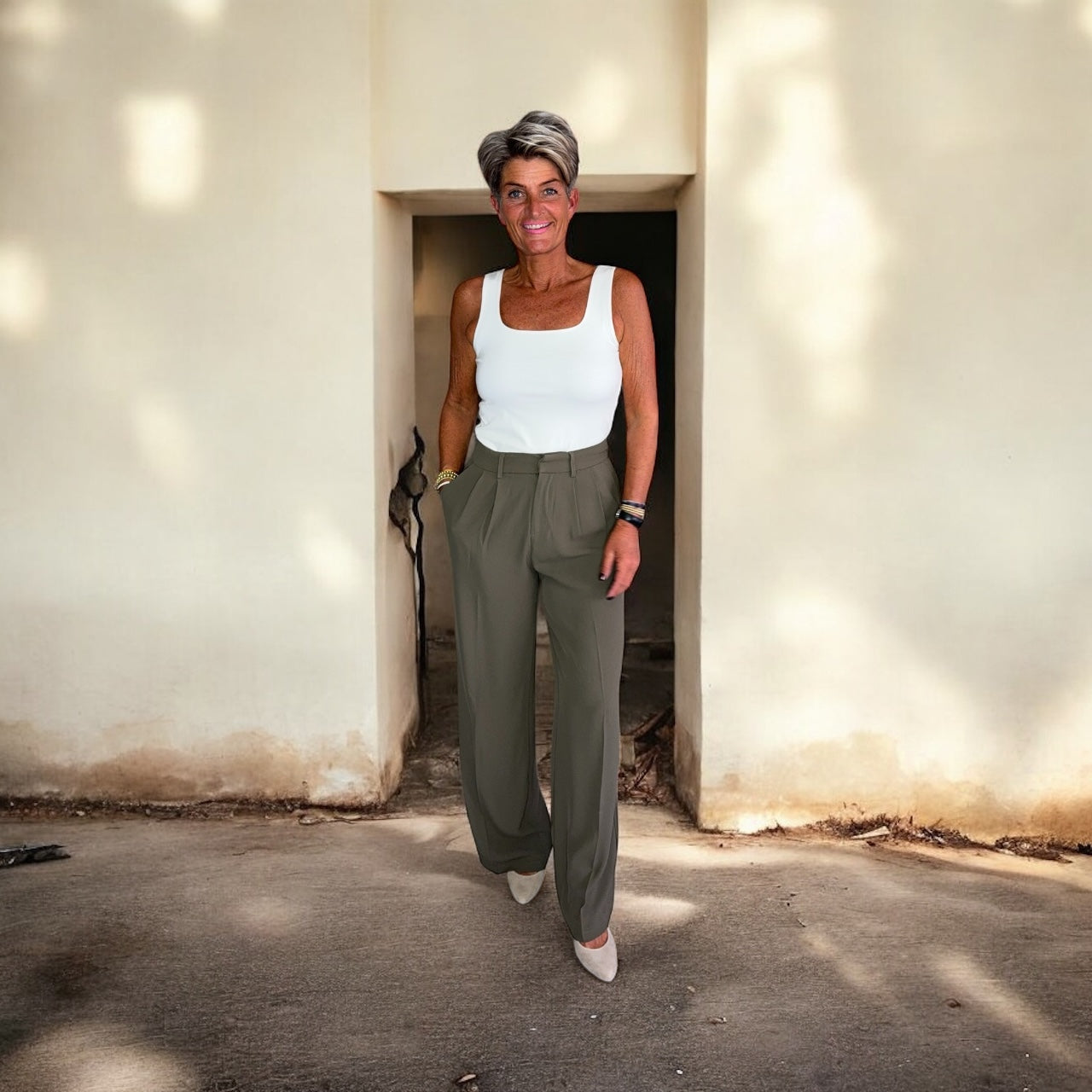 Deze kaki bandplooibroek is de perfecte mix van klassieke elegantie en moderne pasvorm.