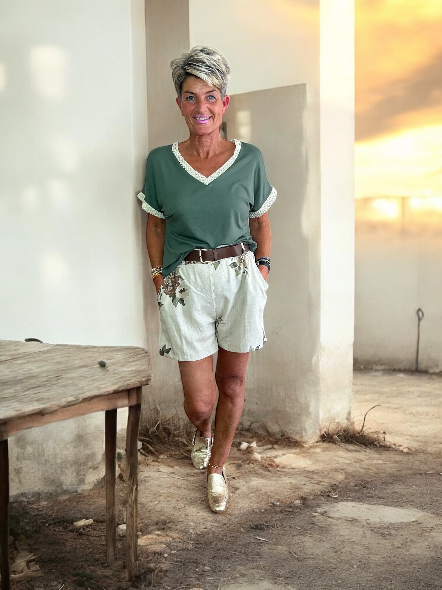 De short heeft steekzakken en bijpassende riem voor een elegante touch