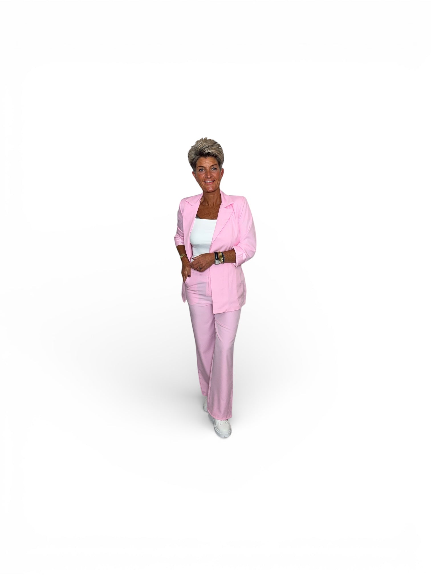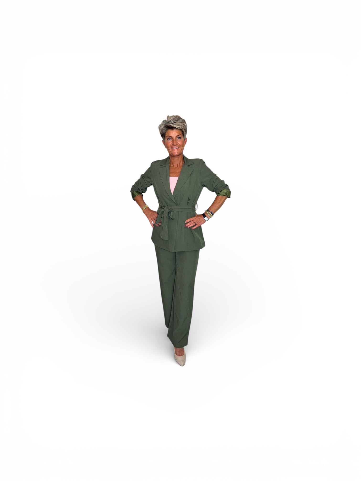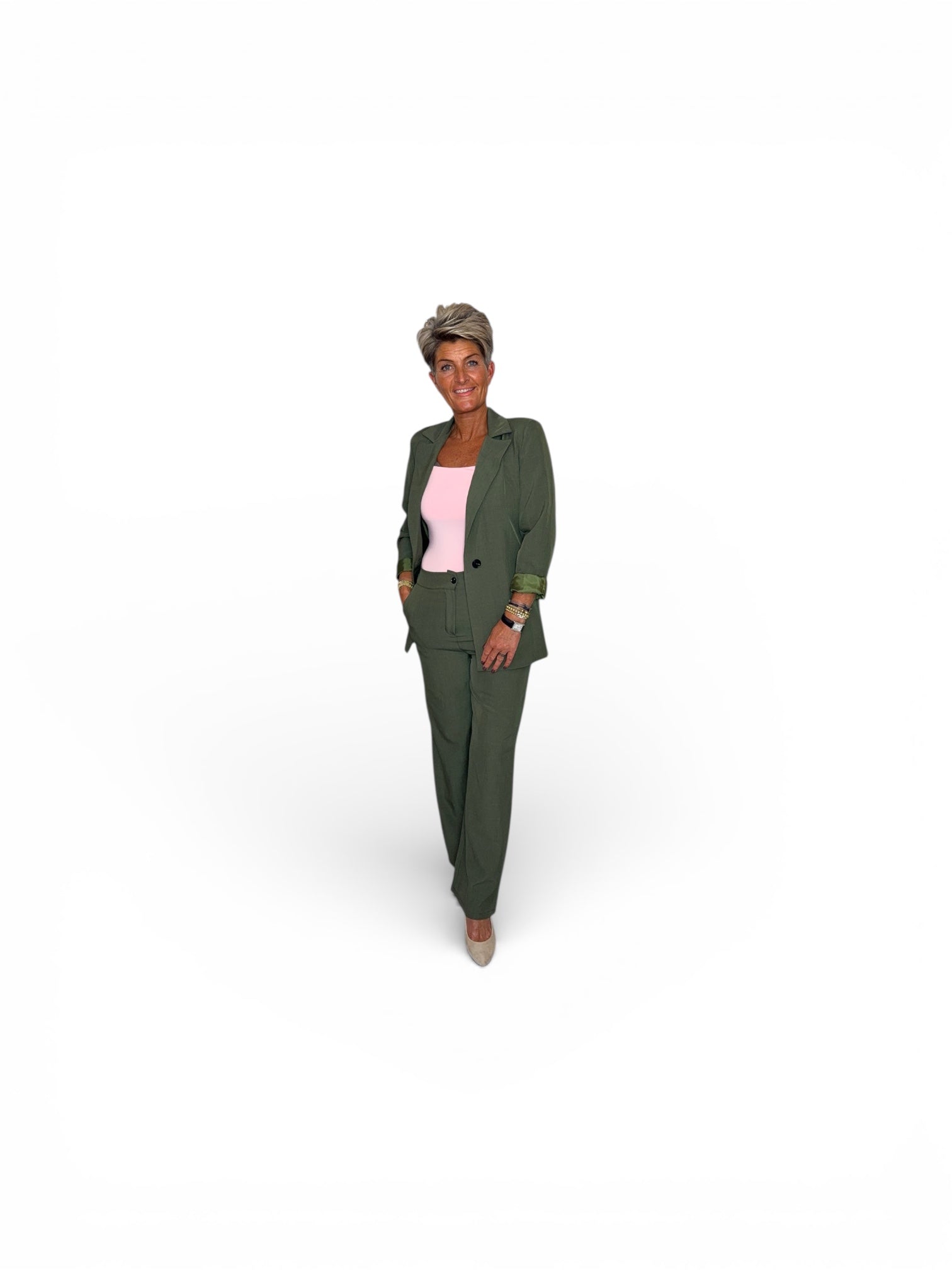 Dit tweedelige pak straalt tijdloze elegantie uit en volgt mooi de vrouwelijke vormen.