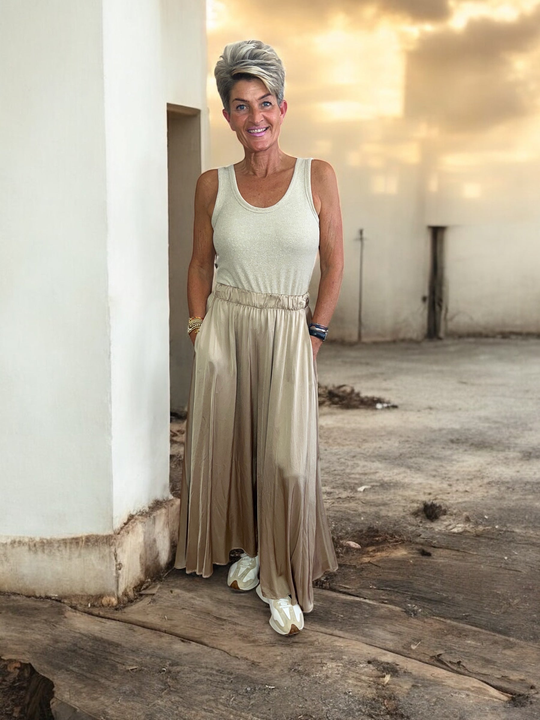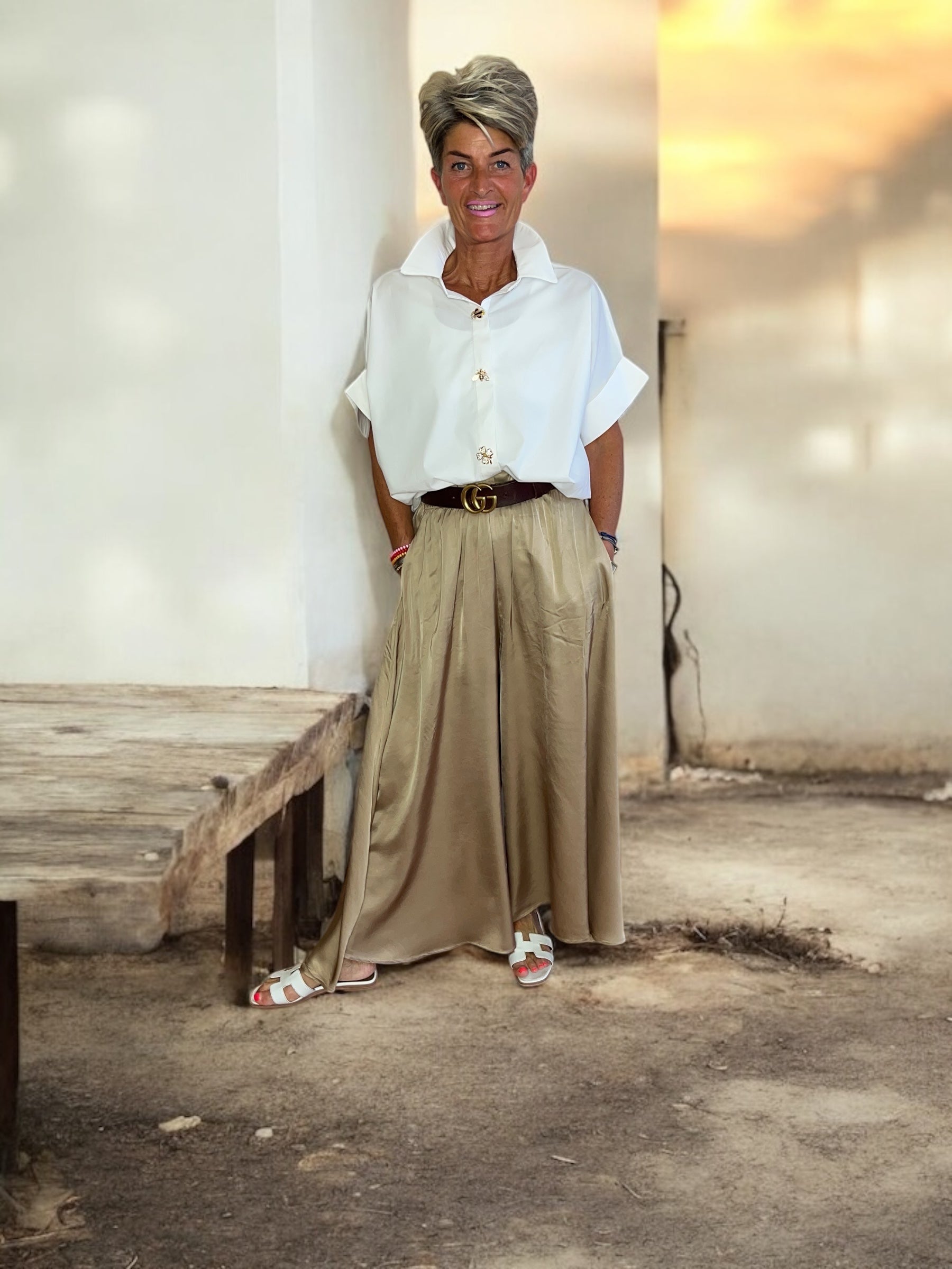 Deze wijde satijnen broek is de perfecte mix van luxe en comfort. De zachte, glanzende stof valt soepel langs je benen en geeft elke outfit een stijlvolle toch.