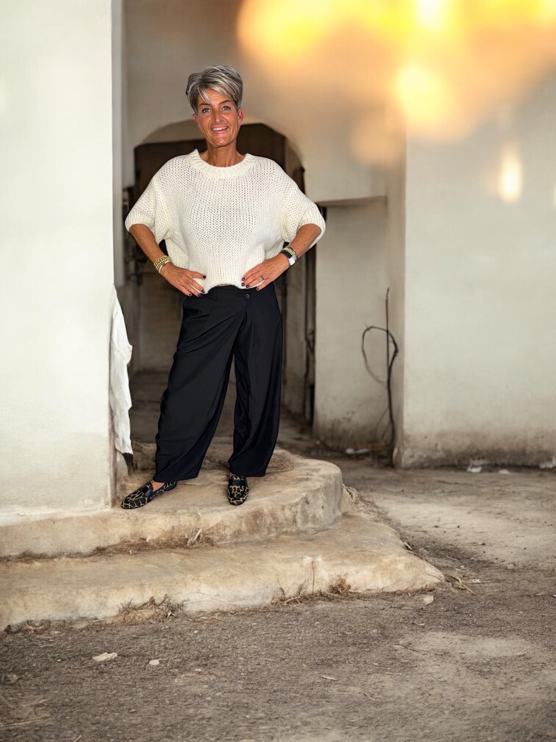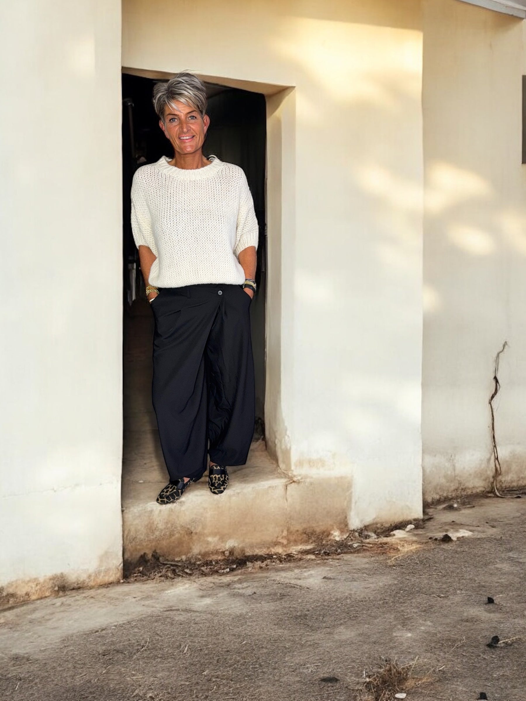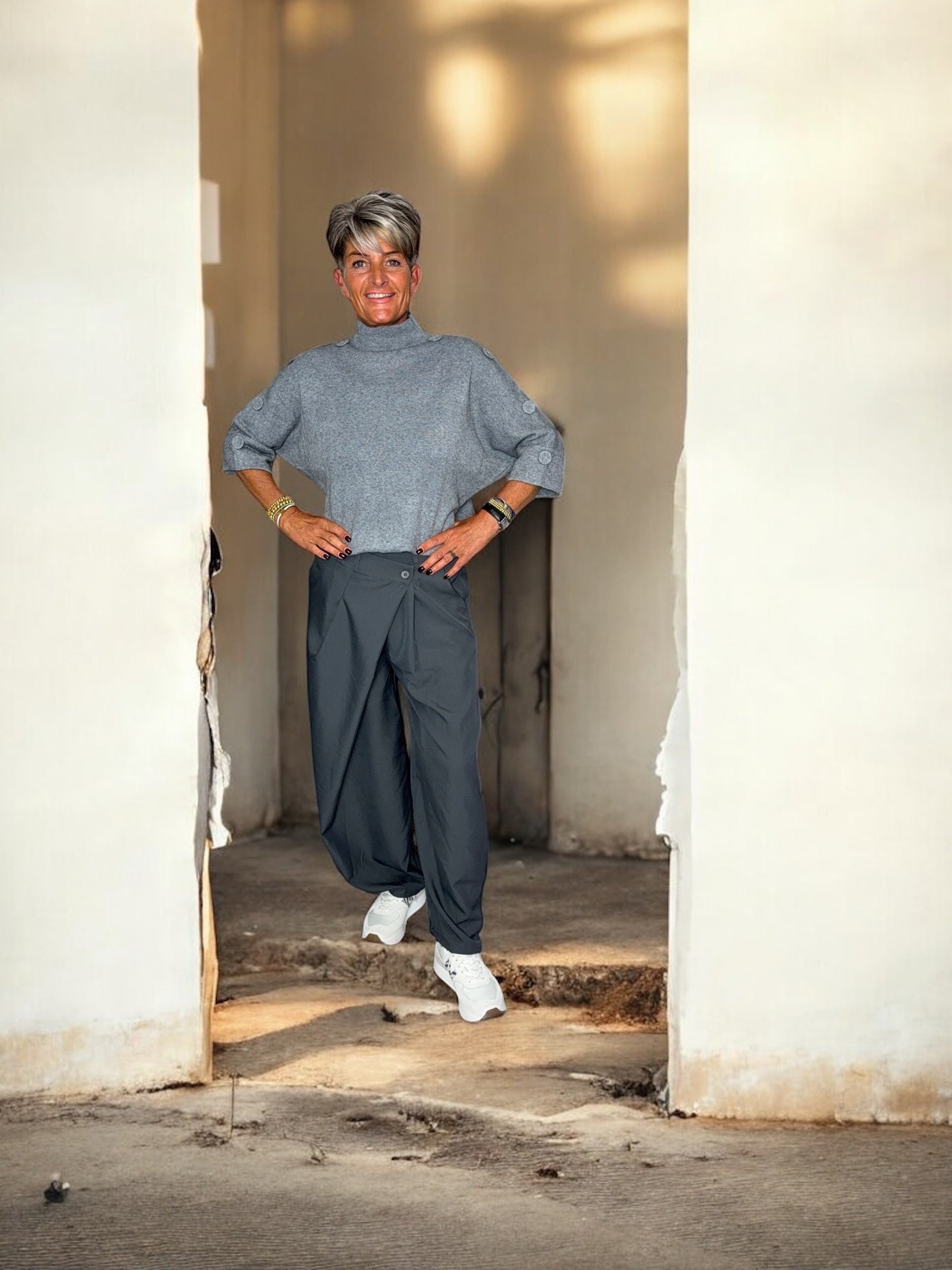 Comfy, cool en een tikje anders , deze overslag broek zit letterlijk én figuurlijk goed.